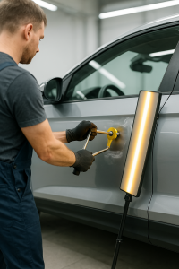 Sanft & smart: Kleinere Dellen und Beulen – zum Beispiel durch Parkrempler oder Hagel – beseitigen wir schnell, kostengünstig und ohne Lackieren. Mit speziellen Druck- und Zugwerkzeugen formen wir das Blech schonend in den Originalzustand zurück – umweltfreundlich und werterhaltend.